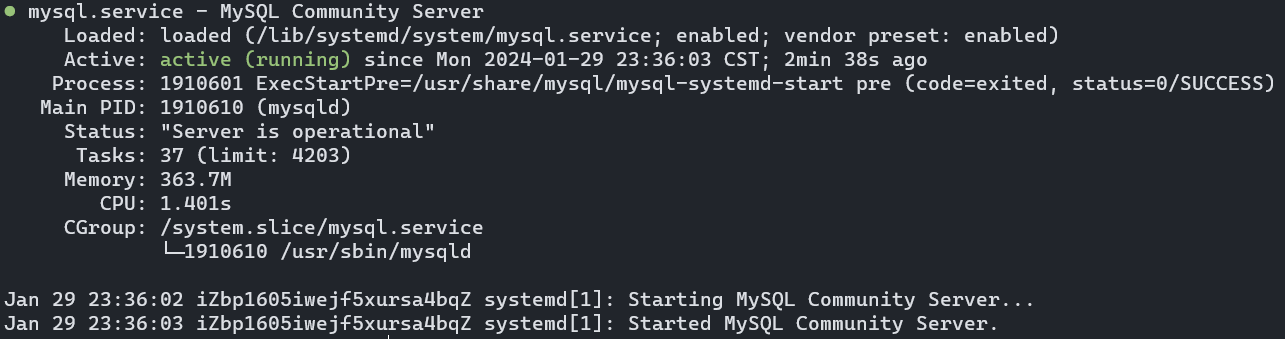 之后,MySQL 服务就安装完成并启动了,输入下列命令可以查看服务状态。